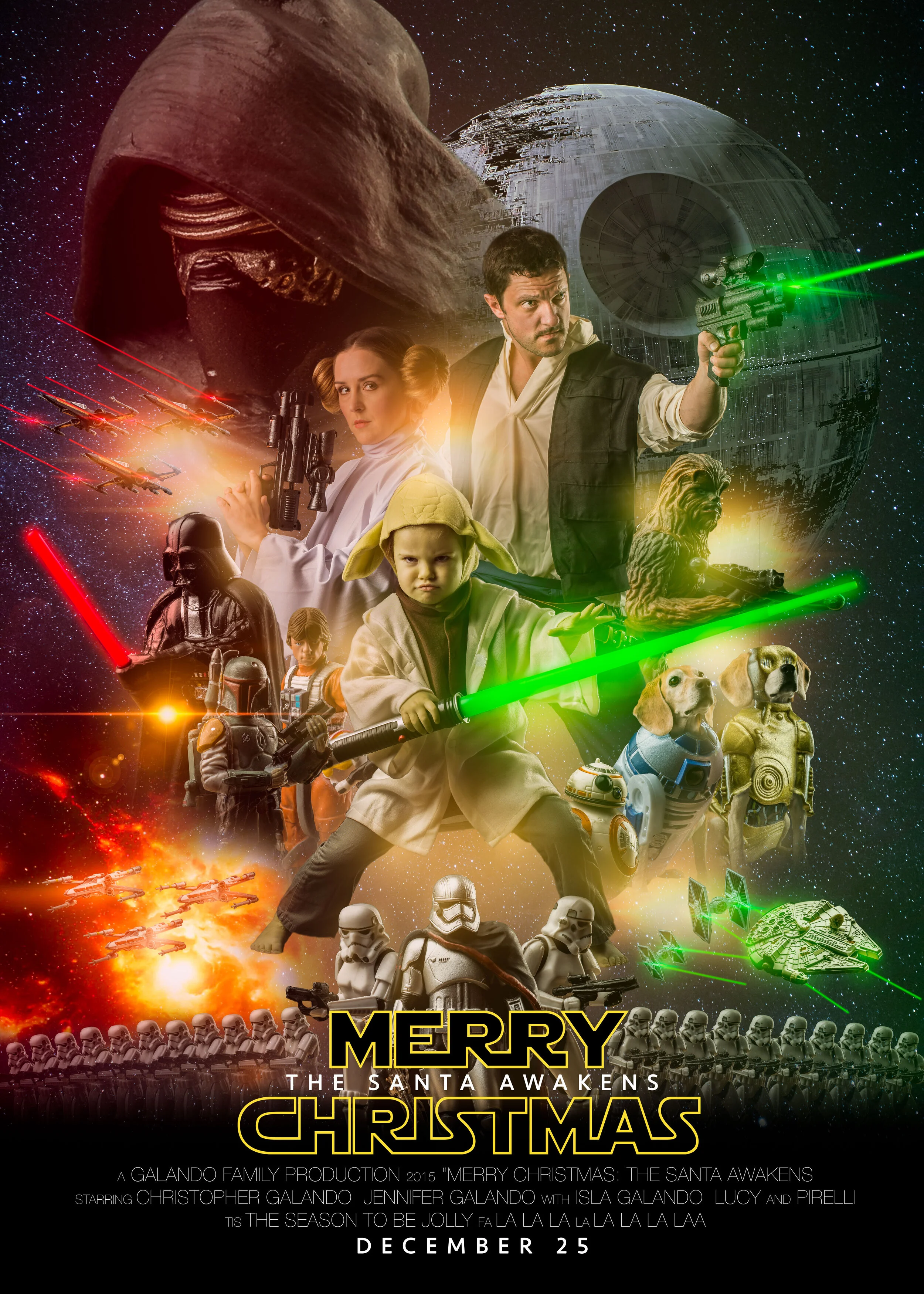 2015 - The most technically challenging! Images taken from toys and lighting effects done in Photoshop. About 125 layers in Photoshop total for a 2 gigabyte file. Our daughter Isla only needed one photo to nail her part, painted green in Photoshop