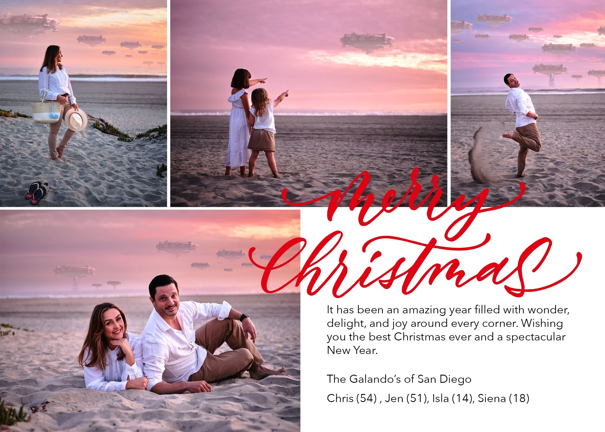 2020 - Our take on the iconic family on the beach wearing khakis and white shirts, however we added an alien invasion. When COVID 19 hit we were constantly saying “what’s the worst thing that can happen next?". Well, an alien invasion would take it up a notch. The best part was the spaceships were subtle enough that some of our friends and family did not get it at first!